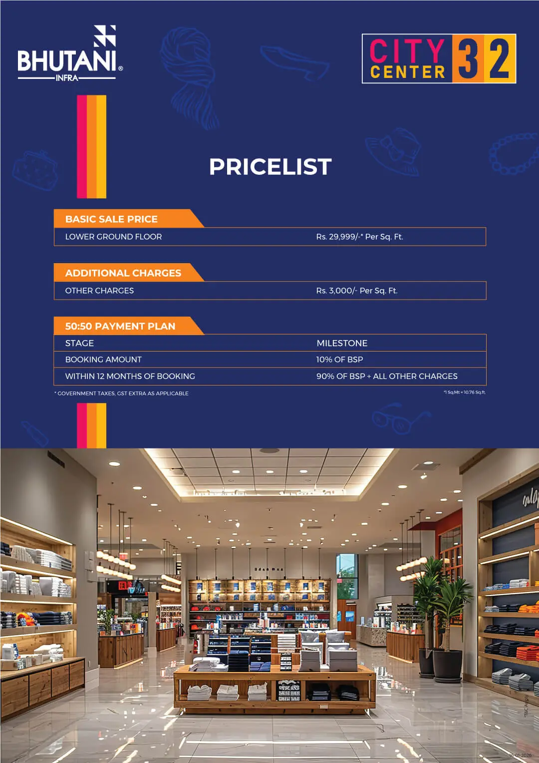 Welcome to Bhutani City Centre 32 the epitome of urban retail sophistication located in the heart of Noida's Sector 32. Designed to offer an unparalleled shopping and lifestyle experience, this mall blends contemporary architecture with vibrant commercial spaces to create a destination for both shoppers and investors. Strategically located in a prime location, this new-age retail mall brings together luxury, convenience, and world-class amenities, offering an unparalleled experience for shoppers, diners, and visitors alike.